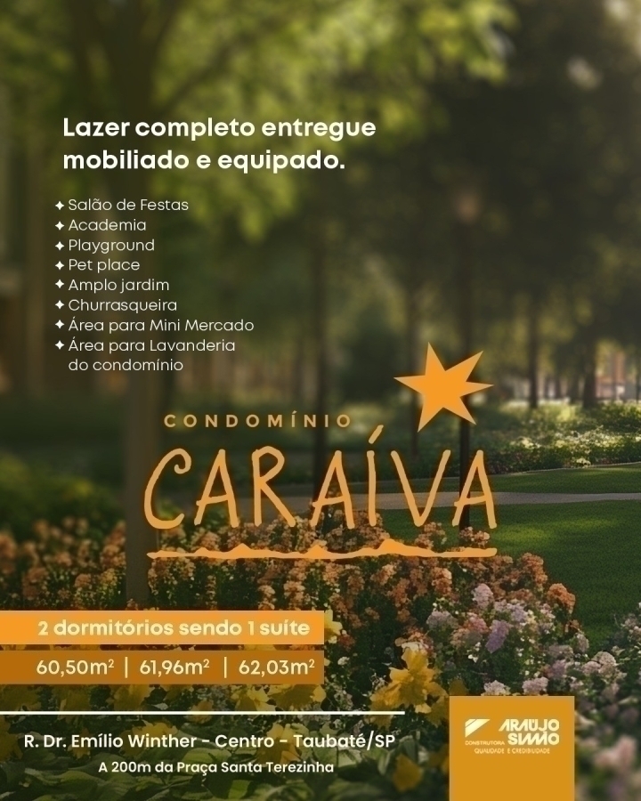 Previous Next Condomínio Caraíva - 2 dormitórios (1 suíte) Um projeto único, com localização privilegiada, entre a Praça Santa Terezinha e a Praça Oito de Maio, a poucos passos de tudo o que você precisa: Universidades, Comércio em geral, Escolas, Instituições financeiras e muito lazer.3 opções de plantas com 2 dormitórios sendo uma suíte. Medindo: 60,50m / 61,96m / 62,03m e 1 vaga de garagem.2 torres com 13 andares cada.Área de lazer entregue mobiliadas e equipadas: Salão de festas, Academia completa, Churrasqueira, Área para Mini Mercado, Churrasqueira, Mini Mercado, Lavanderia compartilhada, Playground, Pet Place e um Amplo Jardim.Em até 40 meses para pagar direto com a construtora ou financiamento bancário.Condição especial à vista.É ideal para morar bem ou investir com inteligência.Viva a alegria de morar no Condomínio Caraíva! R$ 380.000,00 Venda Centro Cód. 335